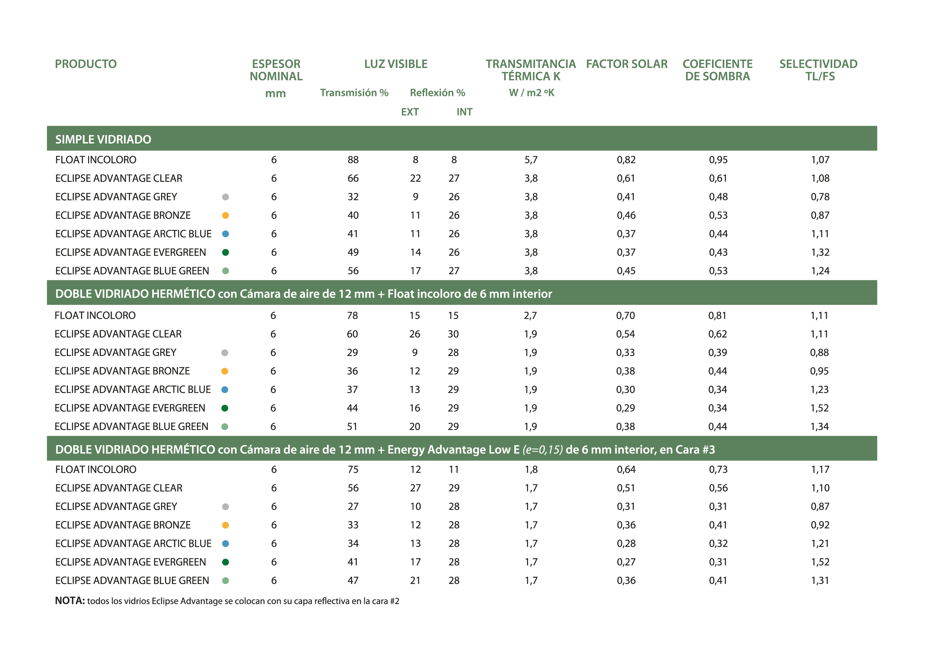 - Flexibilidad de diseño: permite lograr un color definido y natural, con sutil reflexión, una alta transmitancia de la luz visible y control del reflejo interno. El vidrio Eclipse Advantage siempre se coloca en cara #2.