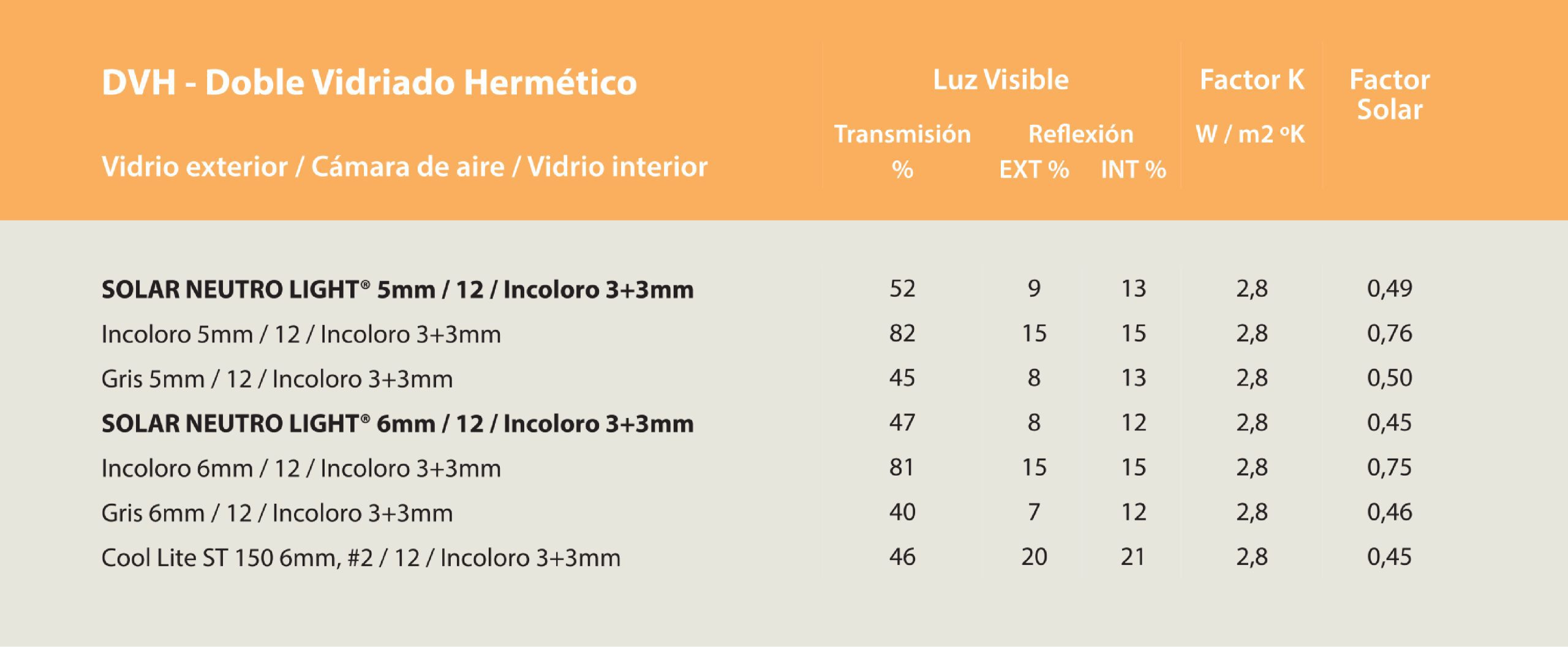 Este producto tiene un tono neutro, sin reflejos, con una sutil coloración en la masa que le confiere sus prestaciones, estética que permite incorporarlo fácilmente a las ventanas de las fachadas actuales. Utilizado en paneles de DVH, como es lo recomendado, cumple con el Código de Edificación de la Ciudad de Buenos Aires, que exige un ingreso de calor por radiación solar directa a través del vidrio (Factor Solar) igual o menor a 0,5.
