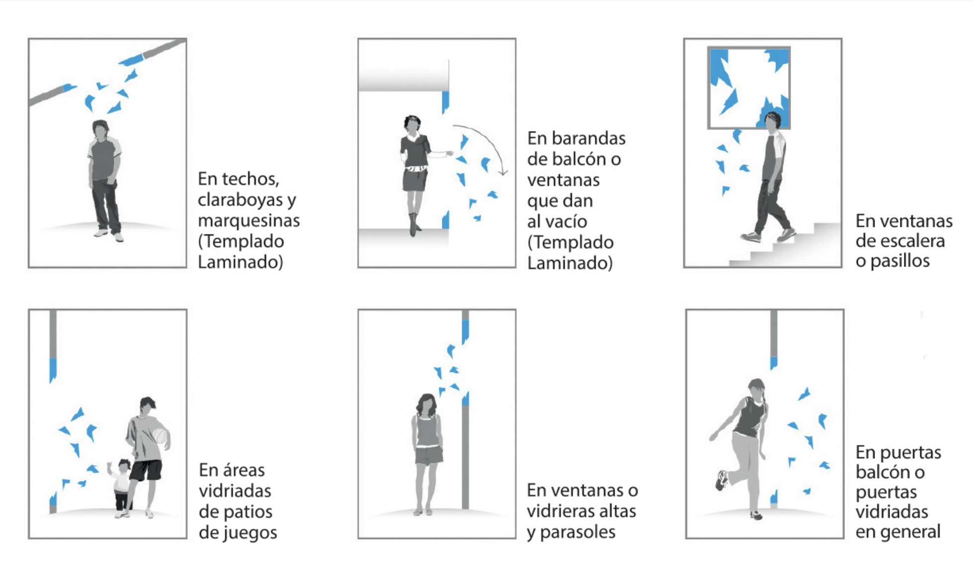 Más del 80% de los accidentes con vidrio se producen en situaciones en las que chocamos contra una puerta vidriada o sus laterales ya que éstas vistas desde el interior, pasan desapercibidas. En los vidrios de baja altura, hay más probabilidades de choques o golpes. En barandas de balcones y escaleras, el vidrio debe brindar un grado mayor de seguridad ya que además de no lastimarnos, debe contenernos. En los techos, debido a las consecuencias que pueden derivar de su rotura, deben ser también laminados.
