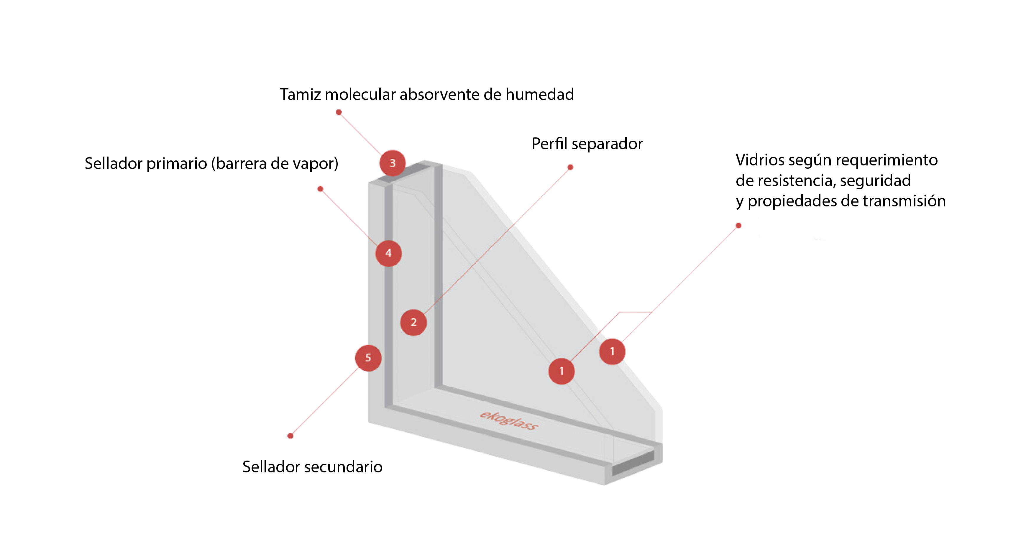 El doble vidriado hermético es un componente prefabricado compuesto por un conjunto de dos o más vidrios Float planos paralelos, separados entre sí por un espaciador, herméticamente sellados a lo largo de todo su perímetro, que encierra en su interior una cámara estanca de aire deshidratado o gases inertes para mejorar el comportamiento térmico y acústico (Norma IRAM 12598-1).